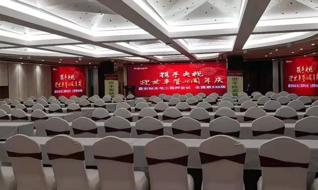 主会场惠安大鹏酒店坐落在惠安县主干道惠兴街,交通发达,方便惠安当地水电工程师及时到场参会。经过世丰管道工作人员紧张有序的高效筹备,世丰品牌系列精品管道展区、世丰管道宣传展板以及精美回馈奖品,都井井有条布置妥当,静候水电工程师的到来!