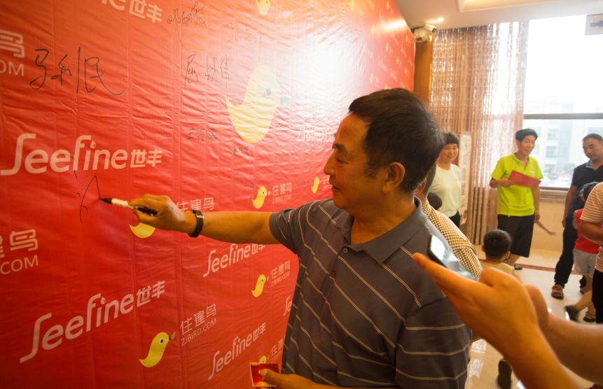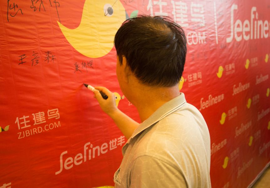 一名参会者在签到墙上写下名字,支持世丰管道。