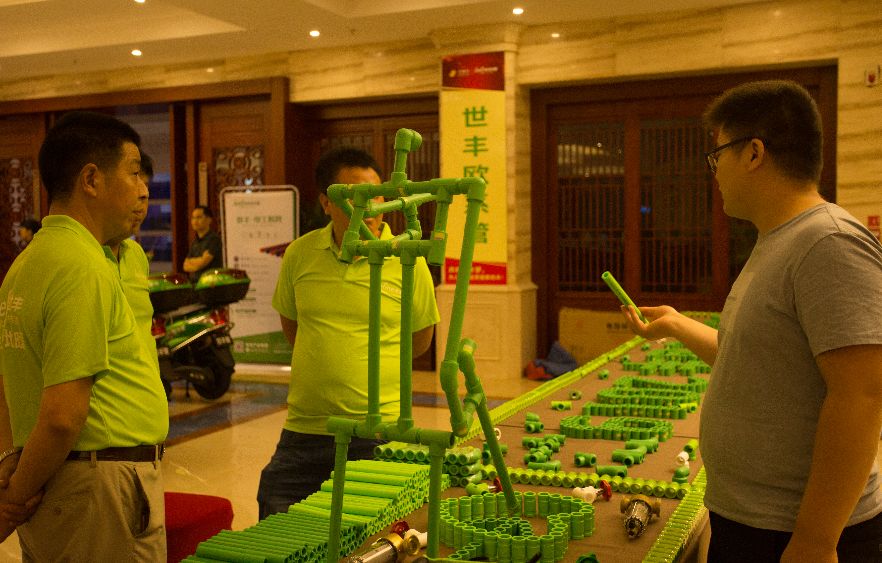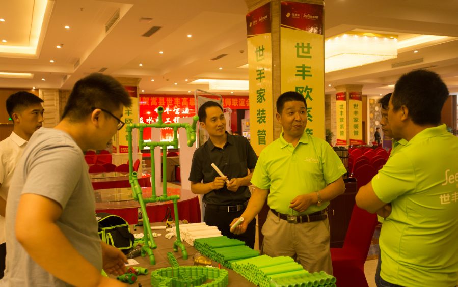 工作人员正在为水电工程师们介绍世丰管道特点。