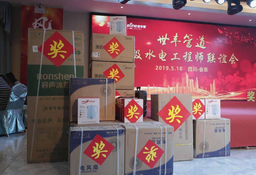 会议现场,世丰管道不仅为会东当地的高级水电工程师们准备了精彩的文艺节目、美味可口的特色晚宴,还为准备了丰富的奖品,以回馈水电工程师们对世丰管道的认可与厚爱。精美的礼品升华了深厚的情谊,在会东活动现场,世丰管道真诚、务实、专业的作风获得了热情回馈,不少水电工程师选择携手世丰管,一起赚大钱!