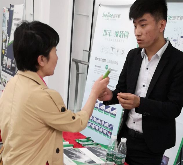 工作人员为参会嘉宾介绍世丰品牌系列管道