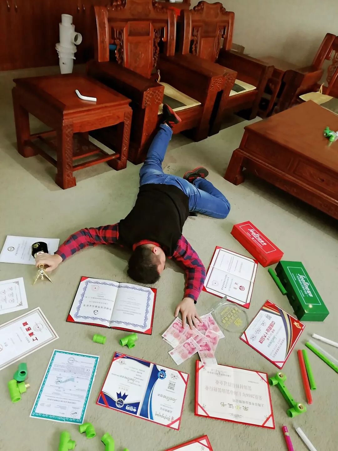 看起来似乎很狼狈,可重点不在这,在地上那散落一地的各种名牌货。